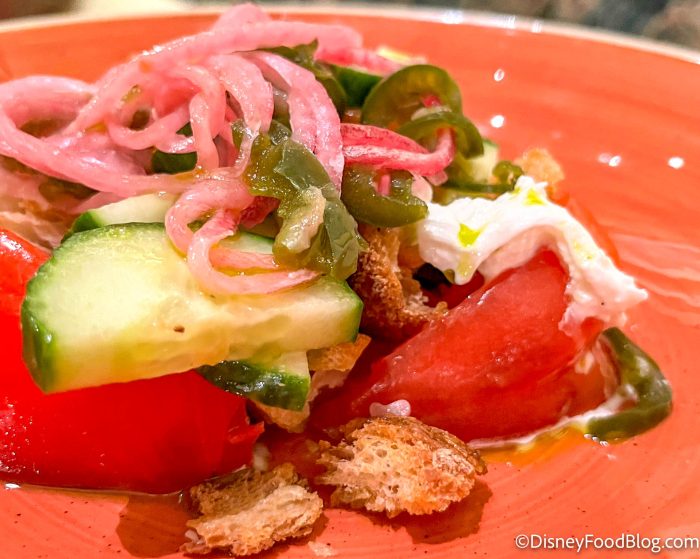 After looking at the new items, we decided to start with some Antipasti, and first up was the Toy Box Tomato Salad. For $12, you get marinated tomatoes with torn burrata cheese, cucumbers, focaccia, pickled onions, and basil.