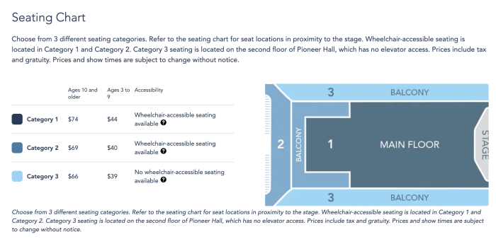 Pricing depends on the seating chart, with main floor seating at the highest price tier. Currently, on Disney’s website, Category 3, the side balconies, costs $66 per adult and $39 for children ages 3 to 9. Category 2, the center balcony, costs $69 per adult and $40 per child, and the main floor, or Category 1, costs $74 per adult and $44 per child. Wheelchair-accessible seating is available in Categories 1 and 2. We will update this post if the pricing changes before reservations go live.