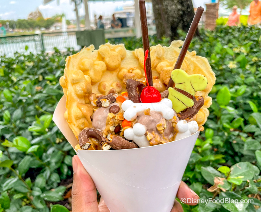 For something more “traditional,” there’s the Mickey Cookie Waffle Sundae. This sundae is vanilla soft-serve, hot fudge, cookie crumbles, and white chocolate chip pearls in a Mickey bubble waffle. It even has two little Oreo ears and a small red bowtie to complete the theme!