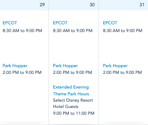 EPCOT will be open from 8:30AM until 9PM on May 29th through 31st with Extended Evening Hours on the 30th until 11PM…