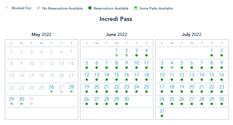 Pixie Dust Pass Holders can only make reservations on weekdays, and May 31st is sold out, so reservations are only available for the 1st through 3rd of June. Magic Kingdom, EPCOT, and Animal Kingdom are available on June 1st through 3rd, and Hollywood Studios is only available on the 3rd.