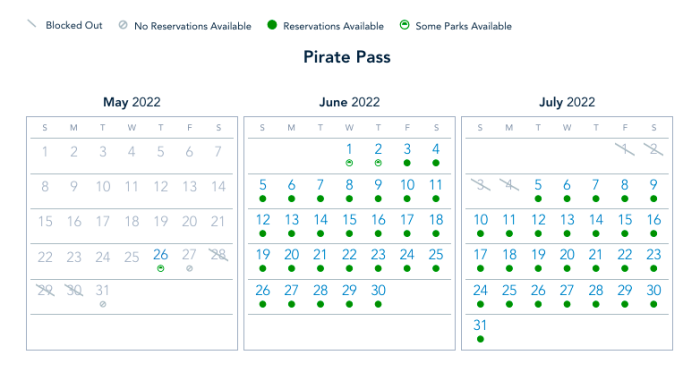 Pirate Pass Holders can only make reservation on June 1st through 4th. May 29th and 30th are blocked out, and May 31st is sold out. Magic Kingdom, EPCOT, and Animal Kingdom are available on June 1st through 4th, and Hollywood Studios is available on June 3rd and 4th.