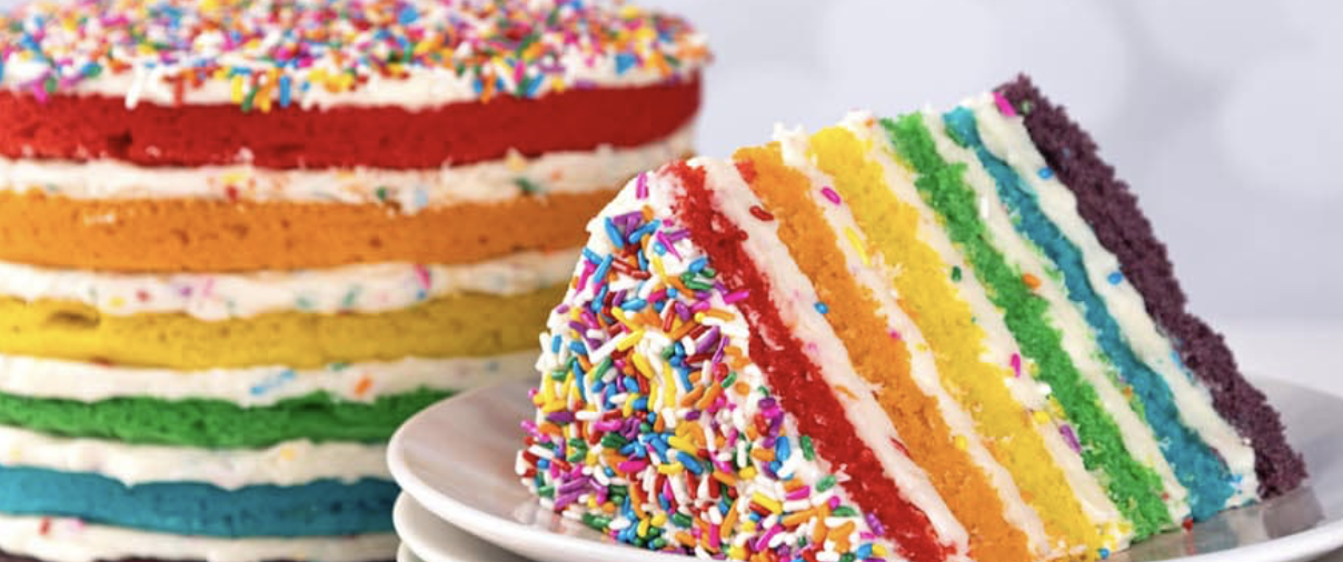 - Pride Cake: Rainbow sponge cake filled with white chocolate mousse, buttercream icing, and rainbow sprinkles