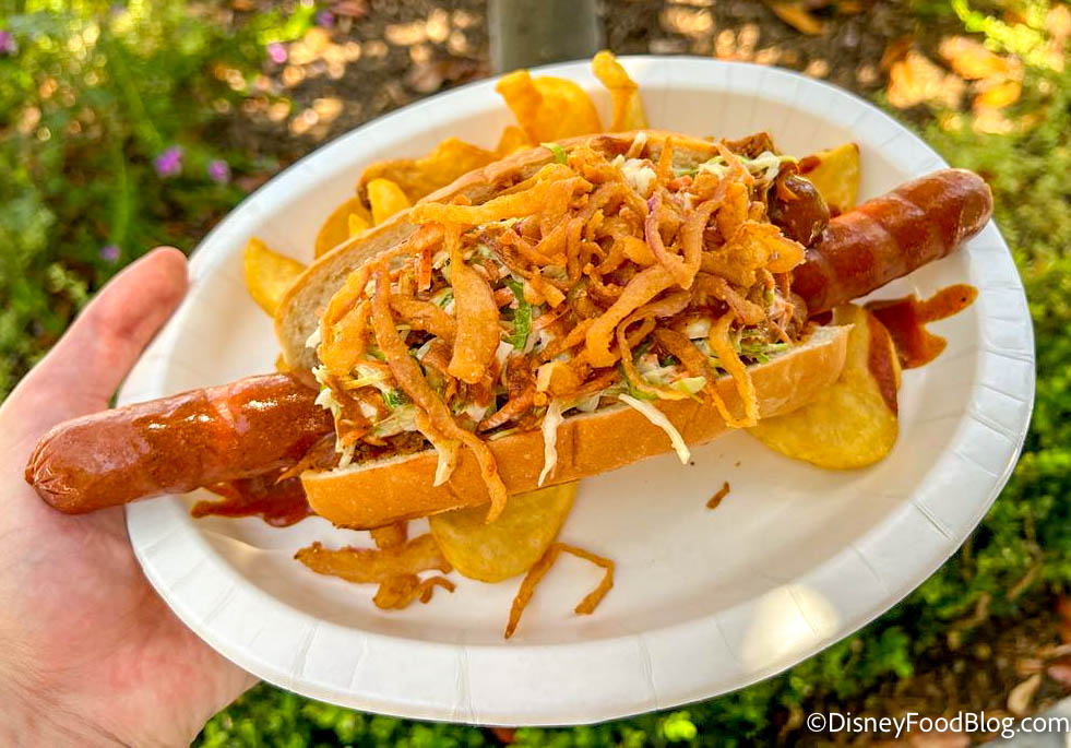 For the Celebrate Soulfully event at Disneyland Resort, Award Wieners in Disney California Adventure added two new menu items, including the Foot-long BBQ Pulled Pork Dog and the Peaches and Cream Funnel Cake Fries. These new eats will be available from June 1st through September 2nd.