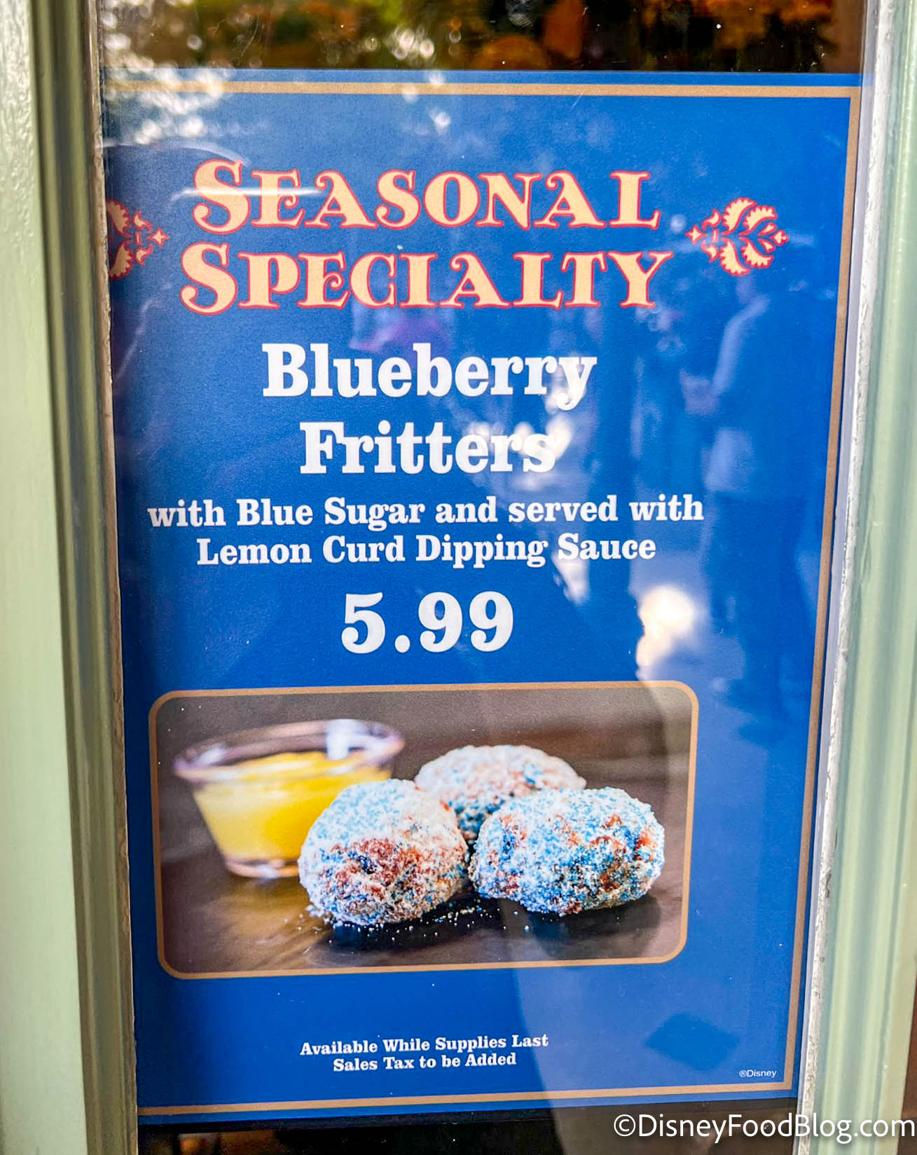 In New Orleans Square, Royal Street Veranda had a new seasonal specialty! Blueberry Fritters were available for $5.99, and they’re covered with blue sugar and served with lemon curd dipping sauce.
