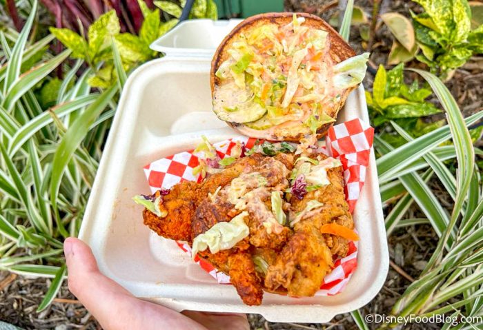We’re not gonna lie, the chicken strips on this sandwich were some of the BEST chicken strips we’ve ever had! They were juicy and tender and the skin was nice and crispy and slid off with each bite. The slaw added a crunch and a little vinegar flavor, but overall it was kind of hard to differentiate all the flavors because of the spiciness of the chicken (we’ll get into that next).