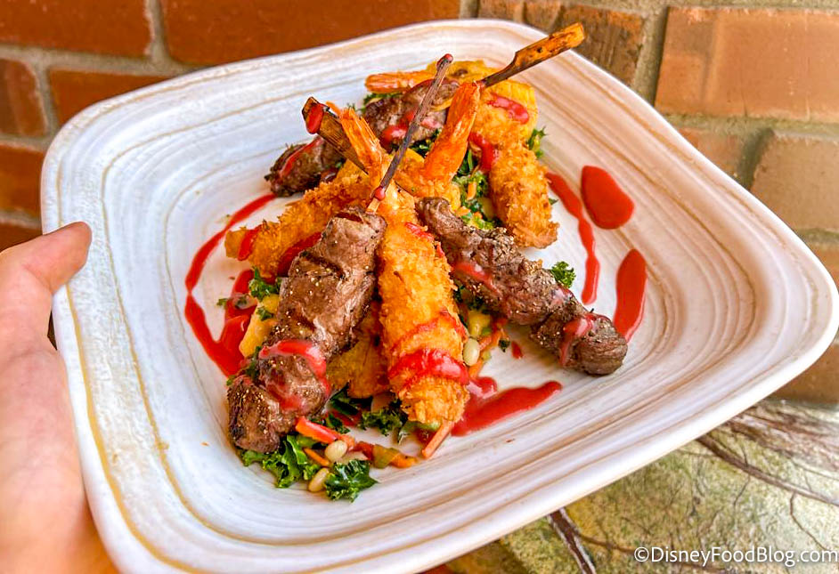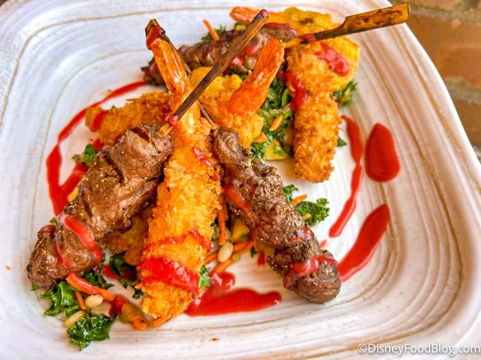 We visited the GCH Craftsman Bar in the Grand Californian Hotel & Spa for another Celebrate Soulfully dish, the Jack Seasoned Beef Tenderloin Skewers and Coconut Shrimp with raspberry rum sauce for $26. This dish was available as of June 1st.