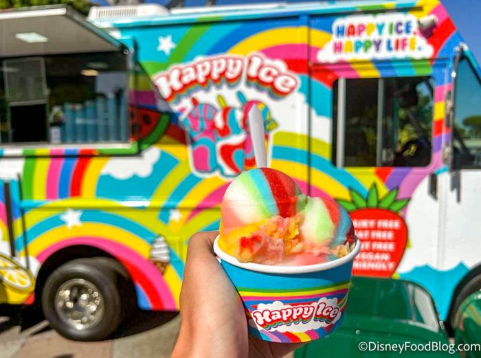 Next, we headed to the food trucks in Downtown Disney for more Celebrate Soulfully things to try! The Rainbow Rocket from the Happy Ice food truck is $7, and it’s available from June 1st through July 4th daily after 3PM. It’s basically a combination of all their Ultra-Premium Philadelphia Italian Ice flavors, including Cherry Bomb, Blueberry Blast Mango Madness, Strawberry Lemon, Pineapple Potion, Sour Apple Lush, Watermelon Lush, and Lucky Lemon.
