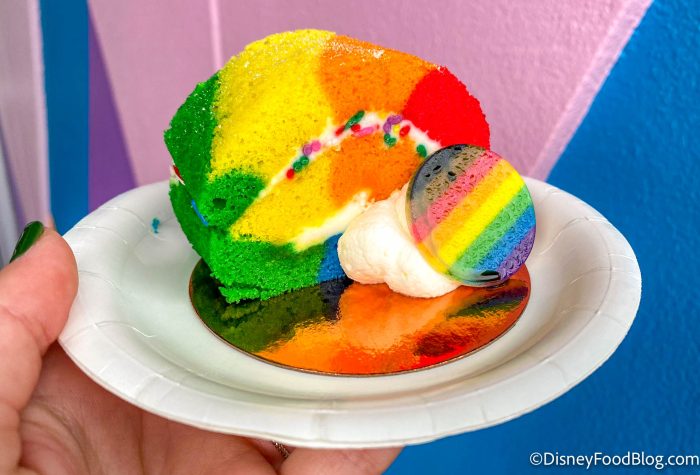 And at Landscape of Flavors in Disney’s Art of Animation Resort, we stopped to try the new Rainbow of Pride cake for $5.79! This cake will be available at a variety of Disney World Resort hotels, and it’s a vanilla cake roll with lemon cream cheese filling and white chocolate decor.