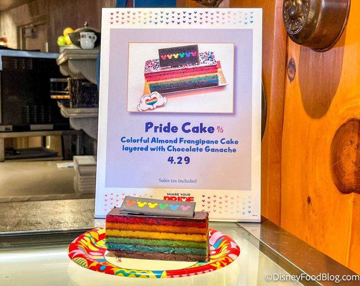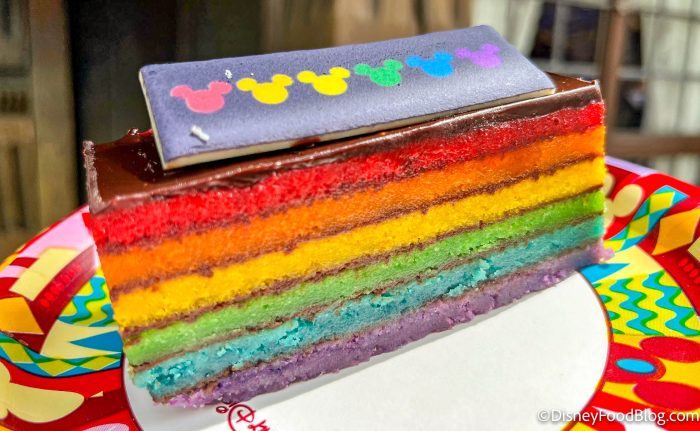 There’s another Pride Month treat in EPCOT! The Pride Cake from Kringla Bakeri og Kafe (in the Norway pavilion) is back from last year, and it’s made with colorful almond frangipane cake layered with chocolate ganache for $4.29. It’s topped with a slab of dark chocolate decorated with rainbow Mickeys.