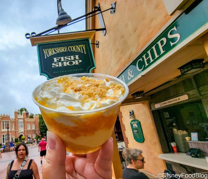 EPCOT’s U.K. Pavilion is where you’ll find the Yorkshire County Fish Shop, which is where you can find the new Queen’s Platinum Jubilee Trifle treat for $4.59! The treat is a lemon curd swiss roll in orange jelly with custard and mandarins topped with almond biscotti.