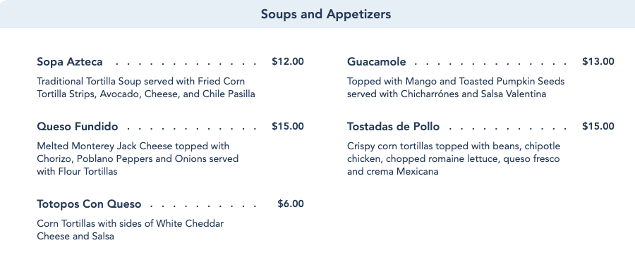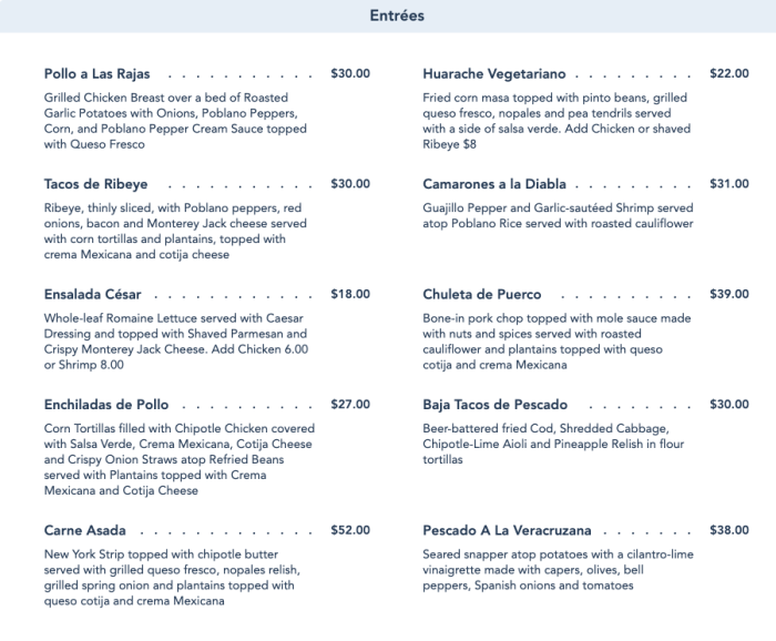 Thirty dollars for a dinner plate at Disney seems pretty much in line with other on site TS prices. These aren’t from Taco Bell, after all. Rib eye steak and some pretty nice toppings to assemble the tacos to your liking. Definitely paying a premium for the atmosphere too. Don’t know that I would pay that much, probably would just get some at the QS if I was in the mood for Mexican food at Epcot, although a friend from a Mexican-American family was favorably impressed with La Hacienda’s food and the fireworks view.