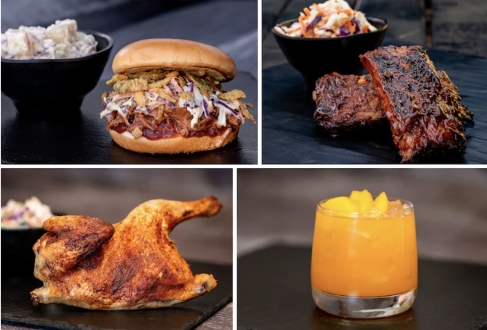 - Family Picnic Platter: BBQ half chicken, pulled pork, ribs, andouille sausage, poblano mac & cheese, chuck wagon beans, potato salad with bacon, creamy coleslaw, jalapeno-cheddar cornbread, pickles, onions, and cherry cheesecake (New)