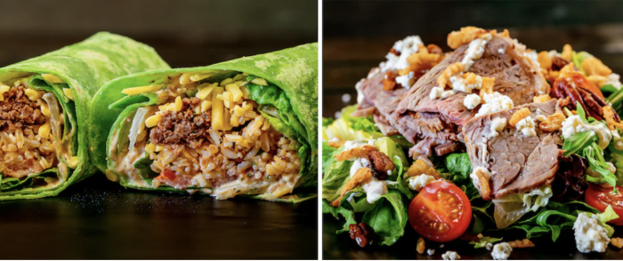 - Hoppin’ John IMPOSSIBLE Royal Wrap: Seasoned plant-based meat with rice, black-eyed peas, “cheddar,” lettuce, and Cajun dressing in a spinach tortilla (New)