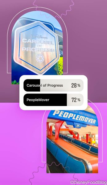 Next up — Carousel of Progress vs. PeopleMover. While the Carousel of Progress was able to snag 28% of the votes, it was the PeopleMover who won with 72% of the votes! The PeopleMover has quite a dedicated, loyal fanbase, so this makes total sense to us.