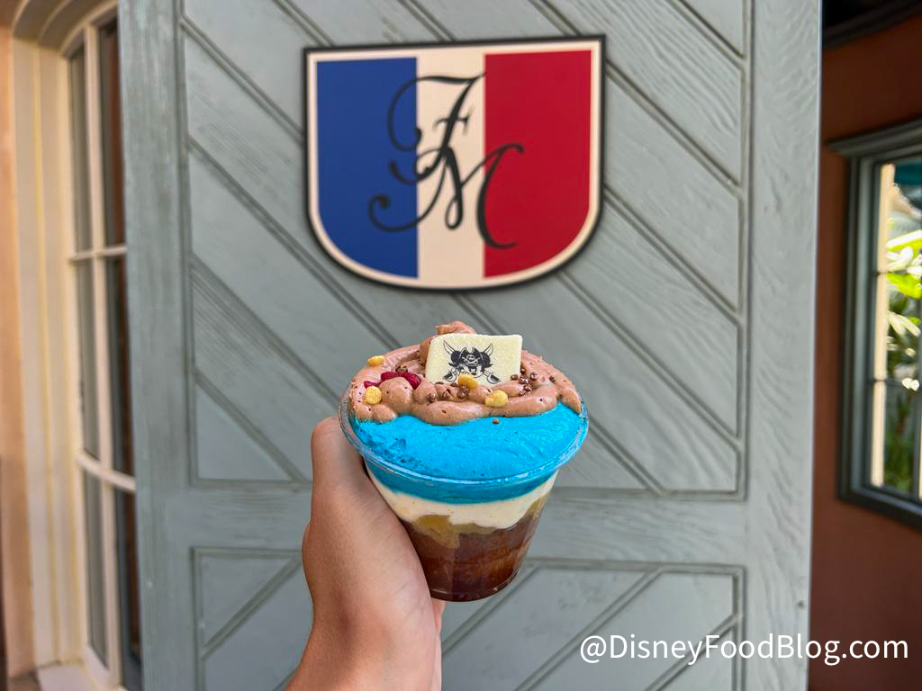 The Pirate P-arrr-fait at the French Market in Disneyland is $7.99 and features vanilla rum-flavored baba, vanilla-pineapple compote, and rum-flavored mousse with assorted decorations on top.