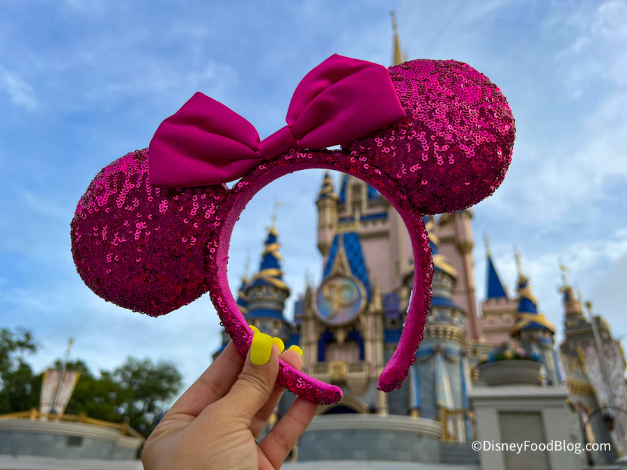 We’re starting with the Orchid Pink Minnie Ears, which cost $29.99 on shopDisney now. These ears are covered in pink sequins with a matching satin bow. And boy are they SPARKLY.