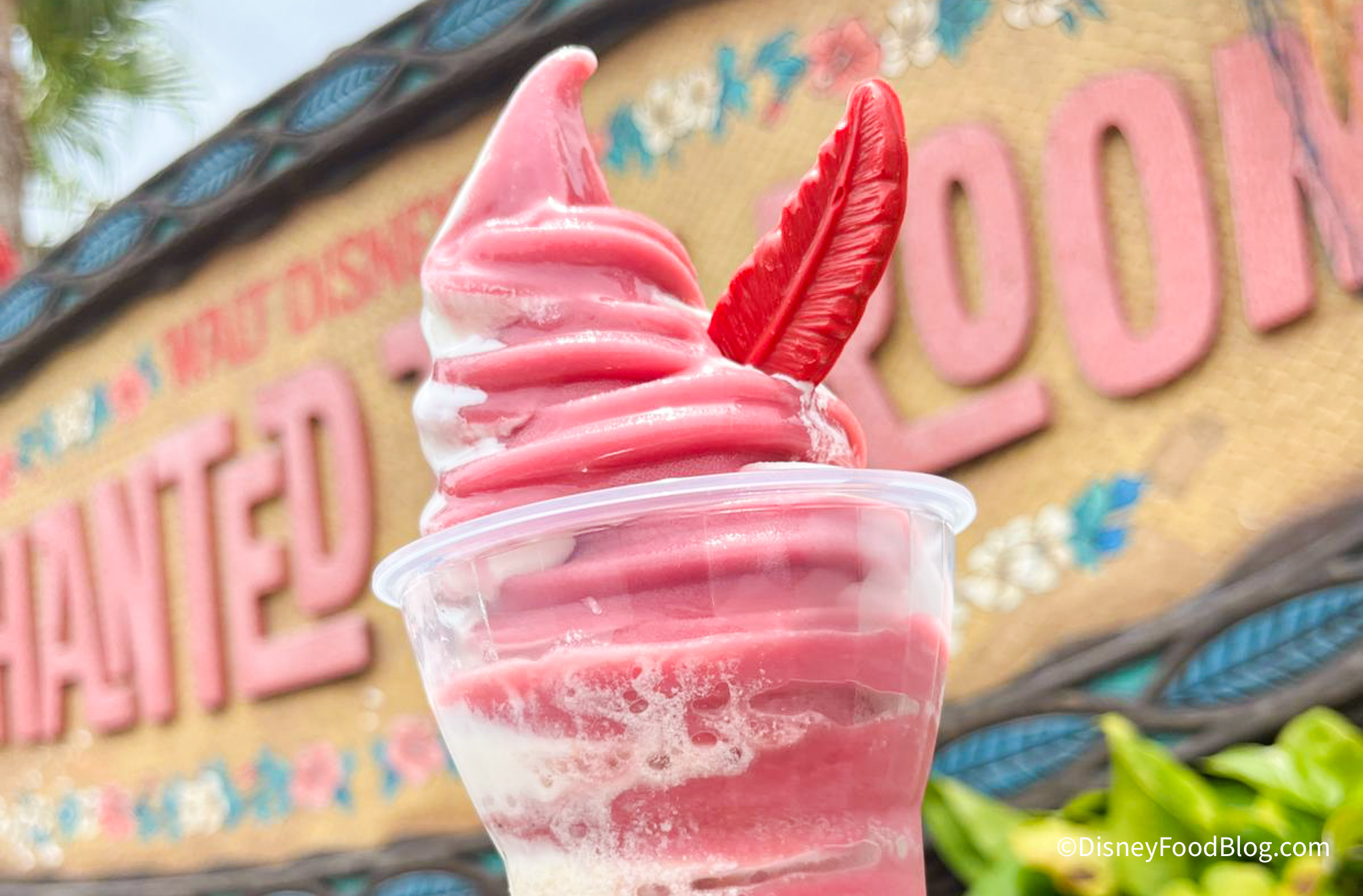 The Fritz Freeze is brand new to the menu at Aloha Isle TODAY and is a raspberry and vanilla soft-serve pineapple float with a red chocolate feather. It is named for Fritz, one of the masters of ceremony at the Enchanted Tiki Room (which explains the chocolate feather).