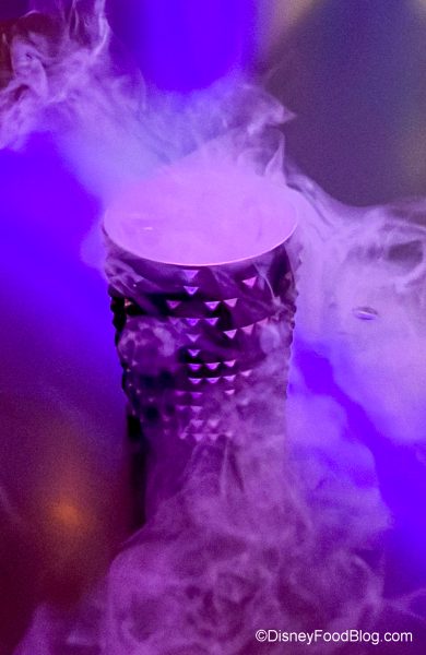 The Berken’s Flow ($16) has SelvaRey Coconut, Rumchata, Godiva Chocolate, and Coconut Water in it — PLUS the Disney Wish is written on top of it in an edible ink that glows under a blacklight.