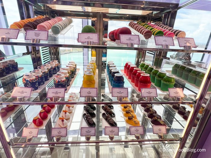 We’re on board the Wish bringing you all sorts of details about the ship, like a tour of the staterooms, plus our review of the Worlds of Marvel restaurant on board, and we even drank out of a bird at the new piano bar on the ship. Now, we’re taking a look at the sweet shop, Inside Out: Joyful Sweets.