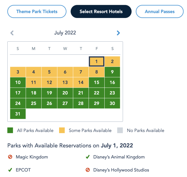 Since it’s a holiday week, let’s take a look at theme park ticket and resort hotel reservation availability!