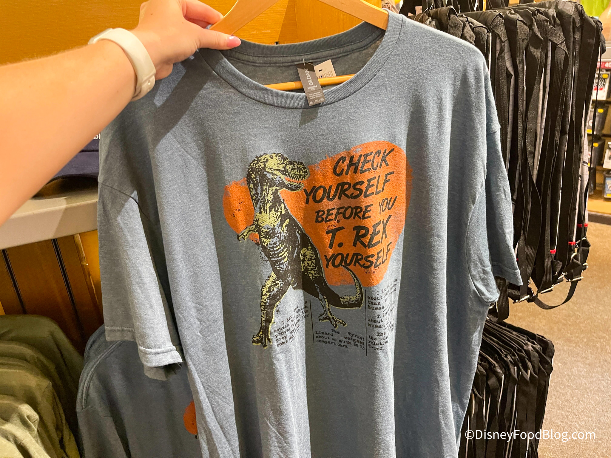 We spotted two new-to-us shirts in the Dino Institute Shop, which is the gift shop connected to the Dinosaur ride. First, we saw this shirt that has a picture of a T-Rex and says “Looking Sharp!” It is $24.99.
