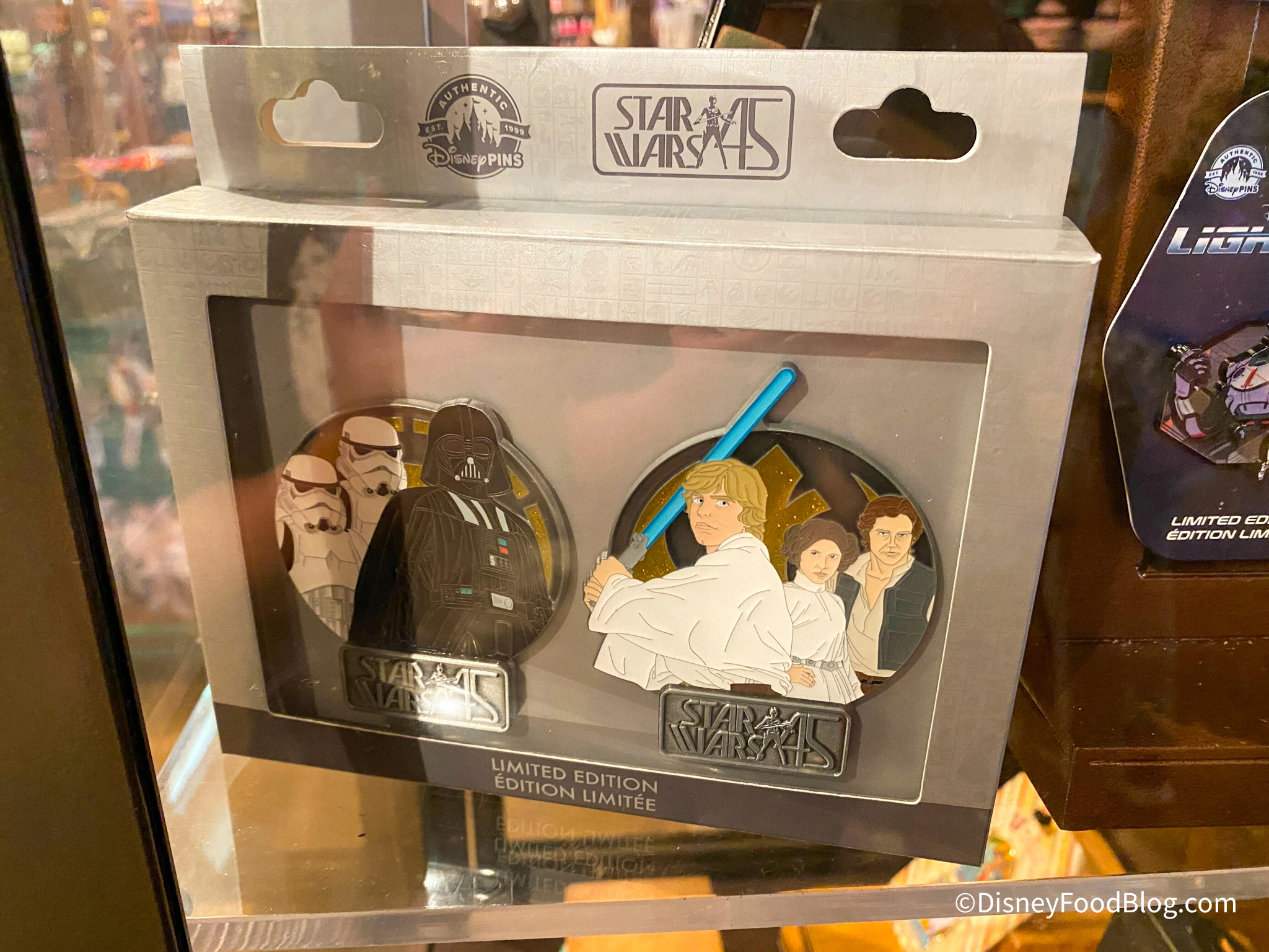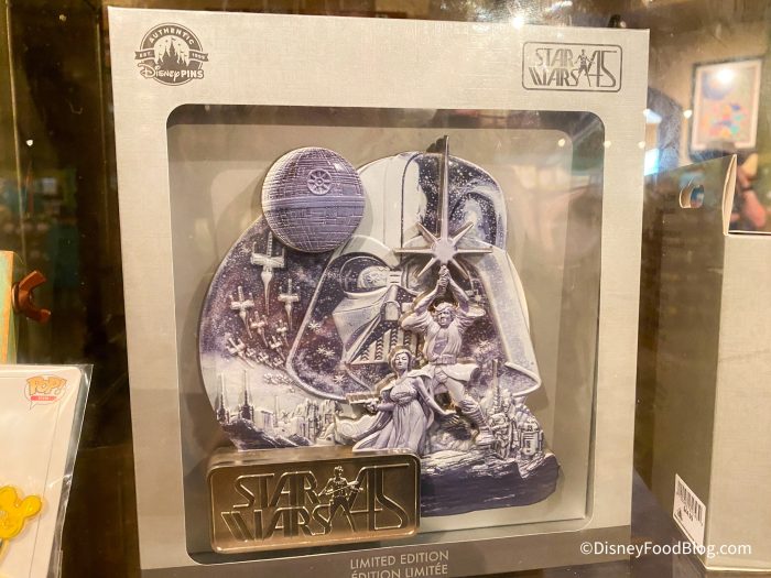 Riverside Depot had tons of new merchandise when we were there recently! Star Wars is celebrating its 45th anniversary this year, and we saw some new limited edition pins to commemorate it! First up, we saw this pretty big pin that looks like the movie poster for Star Wars: A New Hope. This limited edition pin says “Star Wars 45” and is $99.99. Better break open those piggy banks! 😮