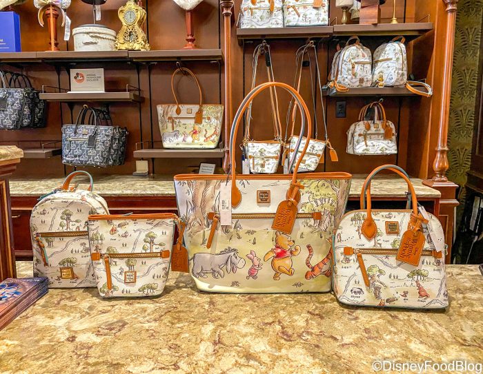 This location got the Winnie the Pooh Dooney & Bourke Collection we’ve seen around the parks! It showcases all of our favorite stuffed friends on a Tote ($328 and a passholder-exclusive item), Satchel ($298), Crossbody ($198), and Backpack ($268).