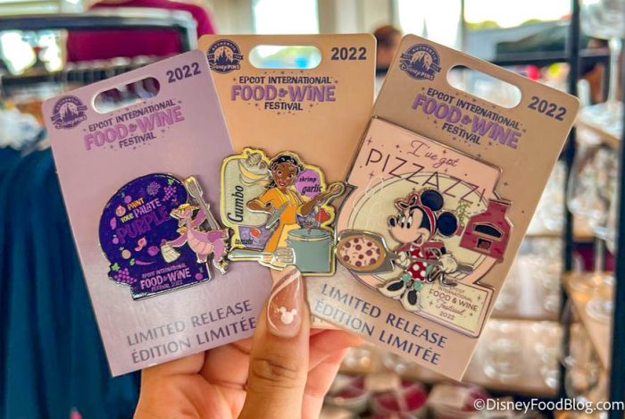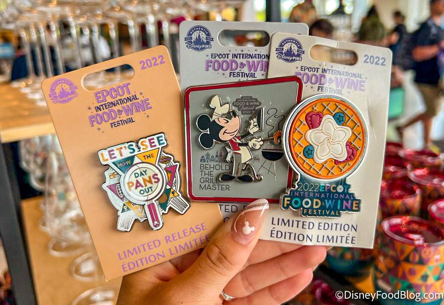 Need even more EPCOT Food & Wine Festival pins? Here’s another three — one says “Let’s See What Pans Out,” one has Mickey on it, and the other has a pretty flower. These pins are also $17.99 each, except for the one with the flower – it’s $19.99.