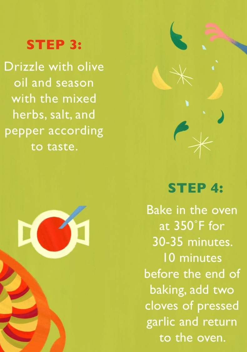 Next, drizzle the vegetables with olive oil and season with the herbs, salt, and pepper according to your taste. Bake in the oven at 350 degrees Fahrenheit for 30-35 minutes. 10 minutes before the end of the time, add your two cloves of pressed garlic and allow them to bake for the rest of the time.