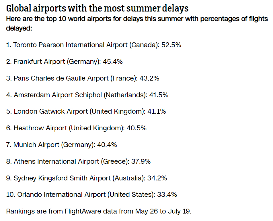 The delays have been so problematic at Orlando International Airport that CNN ranked the airport in the top 10 list of global airports with the most summer delays. Note that Orlando International Airport is the ONLY U.S. airport on this list. The FlightAware data used to rank airports covers the period of summer travel from May 26th through July 19th.