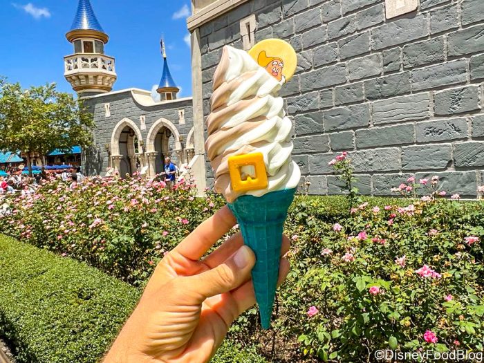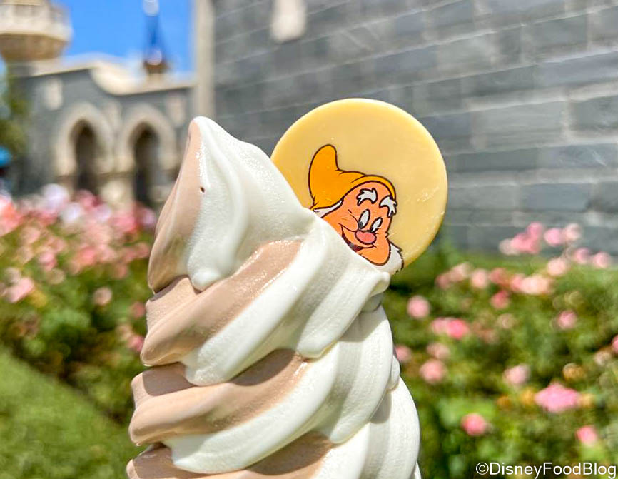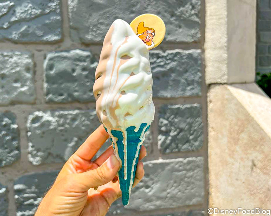 While we walked by Storybook Treats today, we noticed a new soft serve — the Happy Cone! This treat is part of the series of Seven Dwarfs Specialty Cones. We’ve already seen cones themed after Grumpy, Doc, Dopey, and Sneezy. And now, Happy has joined the party!