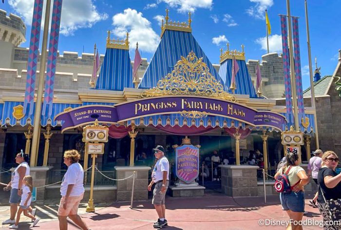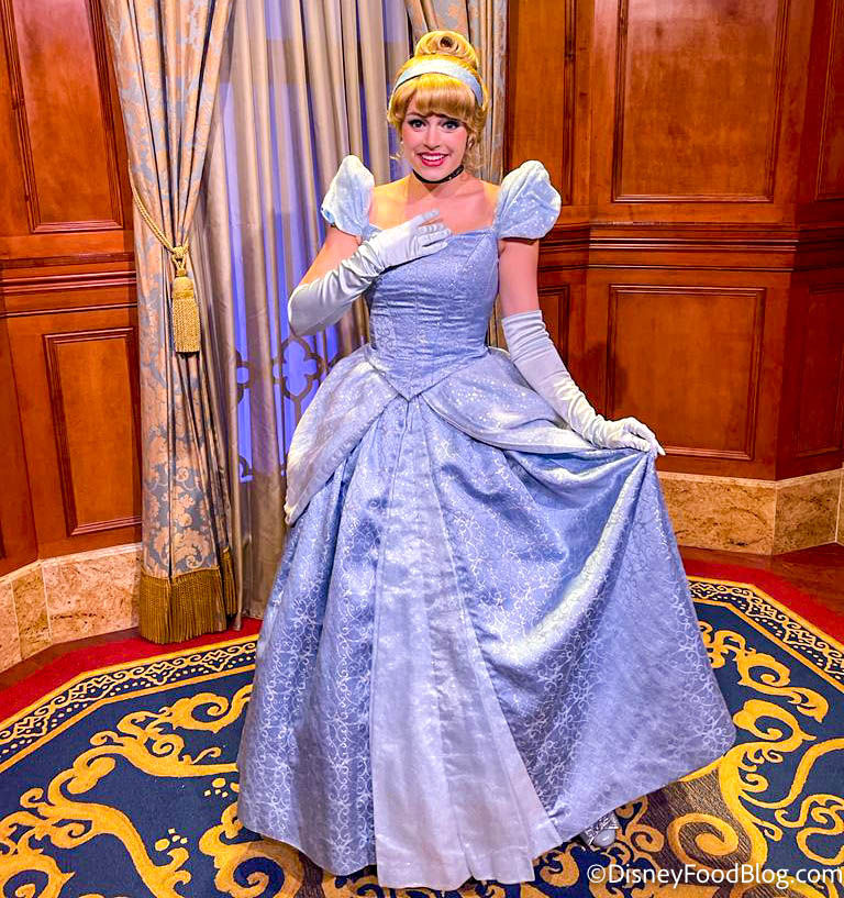 If you want to visit Disney Princesses, you can typically meet Elena, Tiana, Rapunzel, and Cinderella at Princess Fairytale Hall in Magic Kingdom, but sometimes a special visiting princess is there instead! Today, we noticed a mystery princess was visiting alongside Cinderella and our curiosity got the best of us. After all, the standby wait time was only 35 minutes!