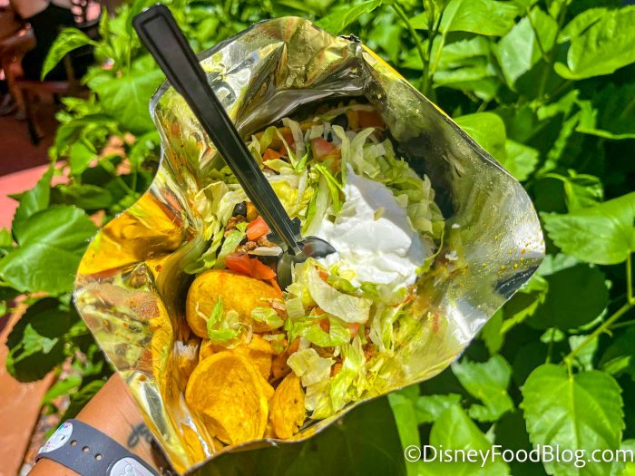 We ate a meal out of a bag at Pecos Bill and we have no regrets. It’s The Walking Taco at Pecos Bill! It’s a bag of Fritos Scoops, topped with ground beef, yellow rice, black beans, cheddar, jalapeno, tomato, and sour cream.