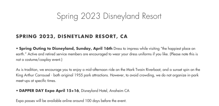 On April 15th and 16th, 2023, get ready to dress in your best attire for Dapper Day at Disneyland Hotel and in the park! The Dapper Day Expo at Disneyland Hotel will take place on both days, and an outing to Disneyland to ride the Mark Twain Riverboat in the afternoon and the King Arthur Carrousel in the evening will take place on April 16th (park ticket and park pass reservation are required).
