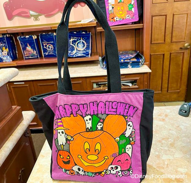 So are you wondering how to get this new Halloween tote? Well, we found it at the counter at Emporium in Magic Kingdom — the bag is $24.99 with any $40 purchase.