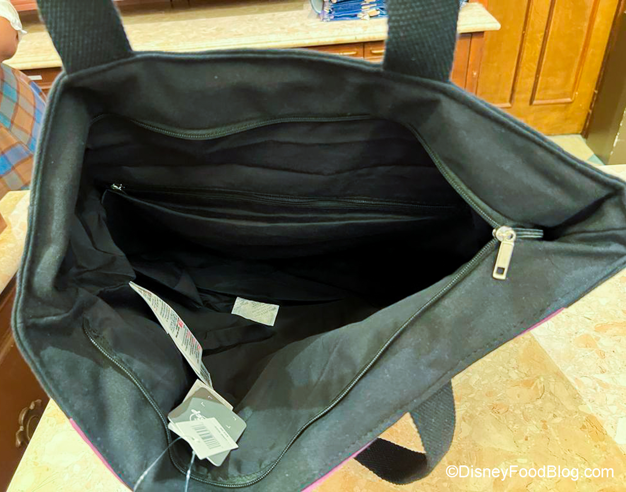 Inside, there is plenty of space for holding all your stuff, souvenirs, or even candy. There’s a zippered compartment inside, plus it zips up, so nothing can fall out!