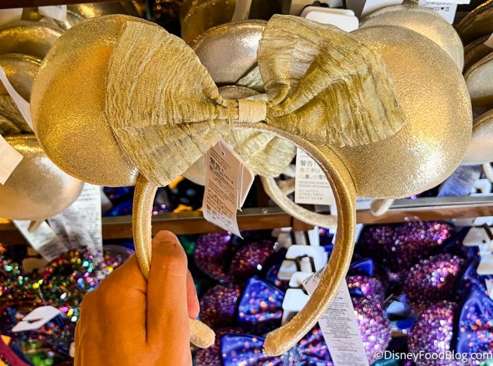 The final ears that we spotted in Disneyland could match just about any Disney park outfit. These are the Almond Pearl Minnie Ears, which feature a shiny material on the ears and a sparkly bow in the middle.