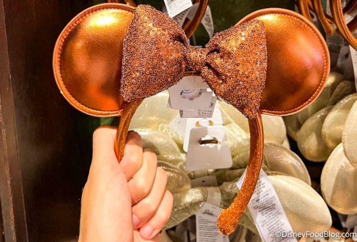 A couple of new Minnie ears that we spotted here have been available online for a while, but this is the first time we’ve seen them in a Disney park. First is the Copper Sequin Minnie Ear Headband, which has shiny copper-colored ears (made of simulated leather) and a matching bow that’s covered in sequins.