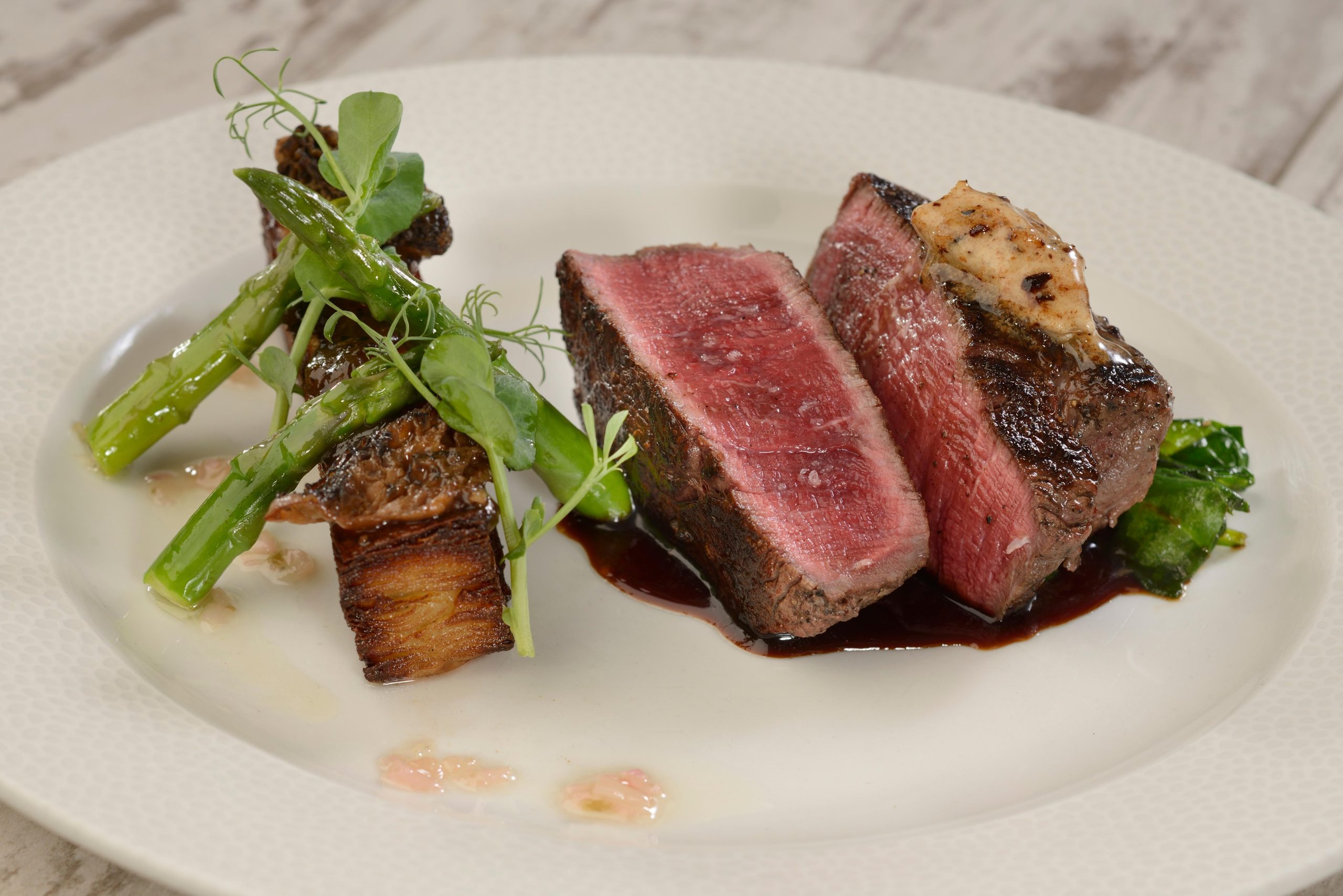 The Filet Mignon is $54, served with potato pave, Bordelaise sauce, asparagus, mushrooms, and shallot vinaigrette.