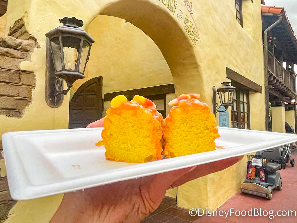It’s almond vanilla cake dipped in white, orange, and yellow chocolate topped with candy corn. And it is Mickey’s Not-So-Scary Party exclusive treat (so you can ONLY get it if you have a ticket to attend one of the parties). Even though this treat is dressed up for a fun night of trick-or-treating, does an almond vanilla cake topped with white chocolate taste the part? Let’s dive in and see!