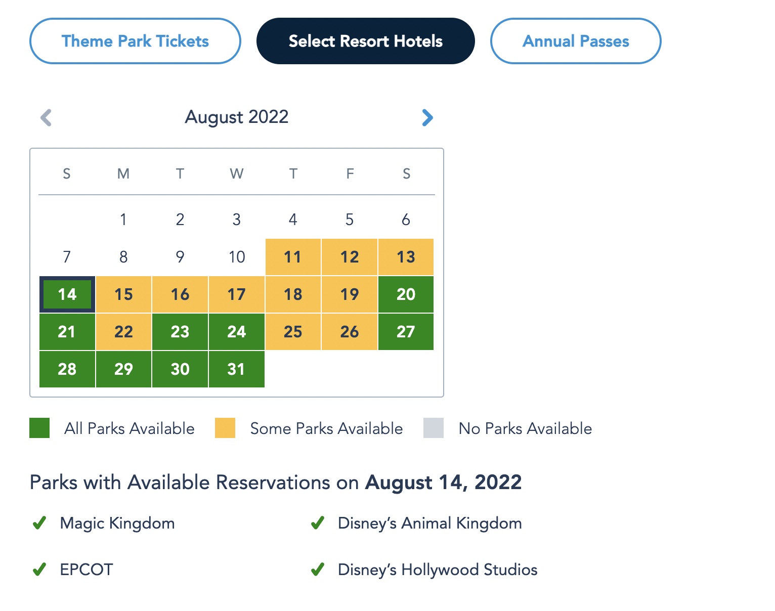 Park pass reservation availability is the same for select Disney World Resort hotel guests as theme park ticket holders. All parks are available on August 14th and 20th, with only Magic Kingdom unavailable from August 15th-17th. Hollywood Studios is the only park unavailable on August 18th and on August 19th both Magic Kingdom and Hollywood Studios are unavailable.