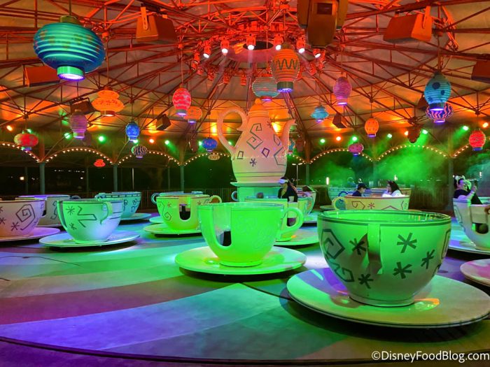 Over in Fantasyland, the Mad Tea Cups have Halloween lighting and some spooky music.