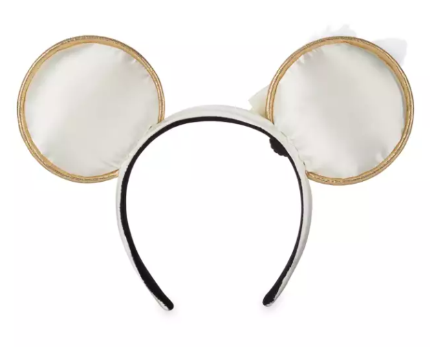 The back of each ear is simple but still elegant, with white satin at the center and the same gold piping here. There’s a black velour fabric lining the interior of the headband, and the outside is covered in white satin as well.