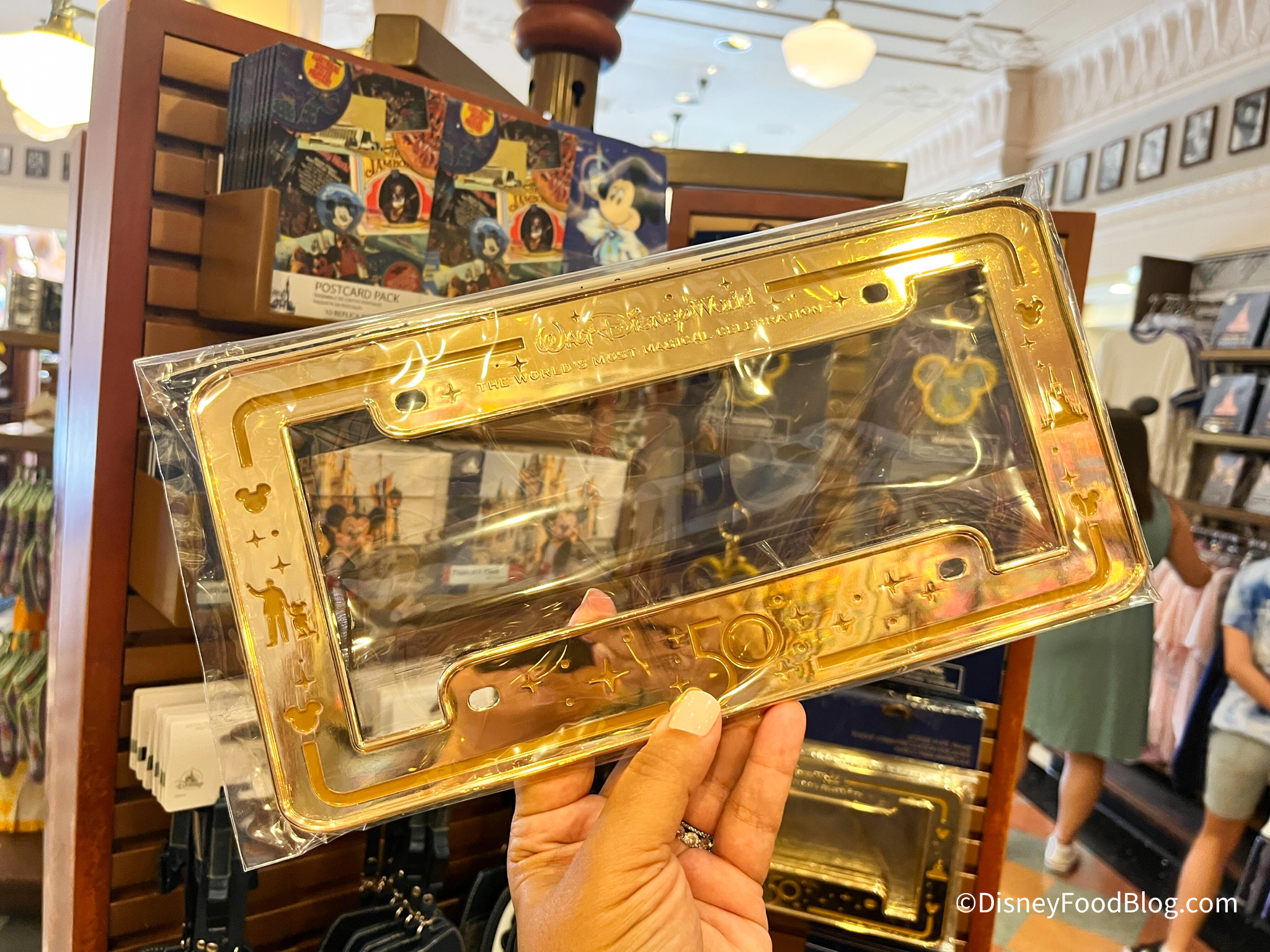 There’s also this Gold 50th Anniversary License Plate Frame for $24.99. It has the 50th Anniversary logo along with images of the Partners Statue (which depicts Walt Disney holding Mickey’s hand) and Cinderella Castle.