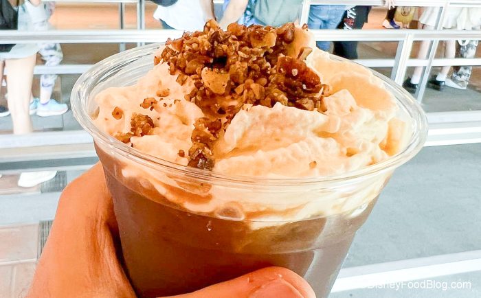 We’re on the hunt for the best fall coffee in Disneyland Resort, and we’ve got one contender hiding out at PYM Test Kitchen in Avengers Campus. Will the Butter Pecan Cold Brew be the next hit drink? This beverage is made with butter pecan-flavored cold brew that’s topped with candied pecans. It’s non-alcoholic and new to Disneyland Resort. You can grab one for $6.79.