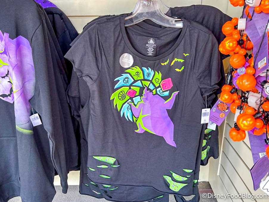 Next in the clothing department, we spotted a black shirt with our man Oogie Boogie on it once again, rolling his dice. Behind him, you’ll find some green and blue designs with things within them that represent different Disney villains, like a dragon for Maleficent or a poisoned apple for the Evil Queen. What other villainous designs do you see?