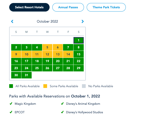 On the days in the yellow, park passes are either gone for Magic Kingdom or Hollywood Studios. EPCOT and Animal Kingdom still have open availability for October.