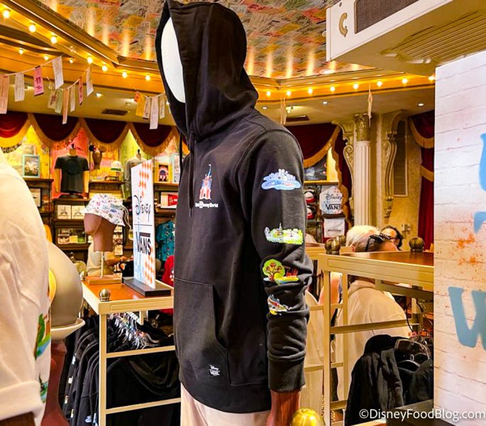 Finally, last but not least we’ll show you the new Walt Disney World Parks Pullover Hoodie for Adults. This black style has cartoon versions of icons from each of the four parks on the sleeve.
