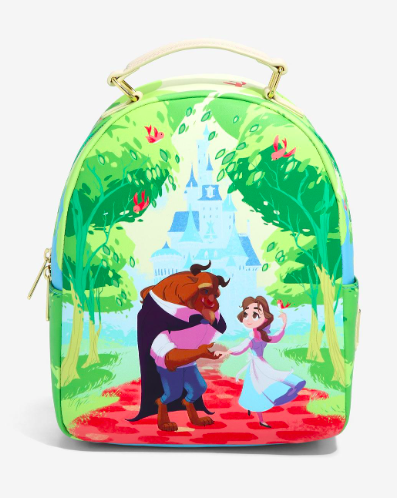 Check out the Beauty and the Beast Scenic Stroll backpack! It features Belle and Beast taking a walk in front of the castle, surrounded by trees and birds.